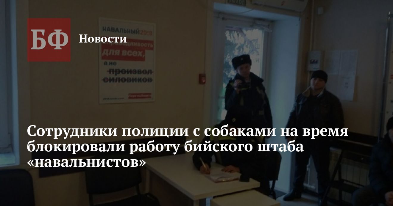 В телефонном разговоре с корреспондентом ИА «Банкфакс» г-н Останин пояснил, что сначала в штабе появились двое полицейских, одетых в штатское. «Они заявили, что им поступил сигнал о хранении в штабе наркотиков и экстремистской литературы. Меня смутил внешний вид правоохранителей, и я на всякий случай вызвал наряд полиции, который прибыл довольно скоро. После этого полицейские в штатском не остались в стороне и тоже вызвали опергруппу. Они зашли, осмотрели помещение, переписали плакаты, которые висели на стене, хотели заглянуть в ящики стола, но я не позволил, поскольку разрешение было лишь на осмотр, а не на обыск. В принципе вели они себя довольно корректно, составили акт осмотра и уехали. Кинолог с собакой даже не стал заходить в помещение», — рассказал координатор бийского штаба «навальнистов».