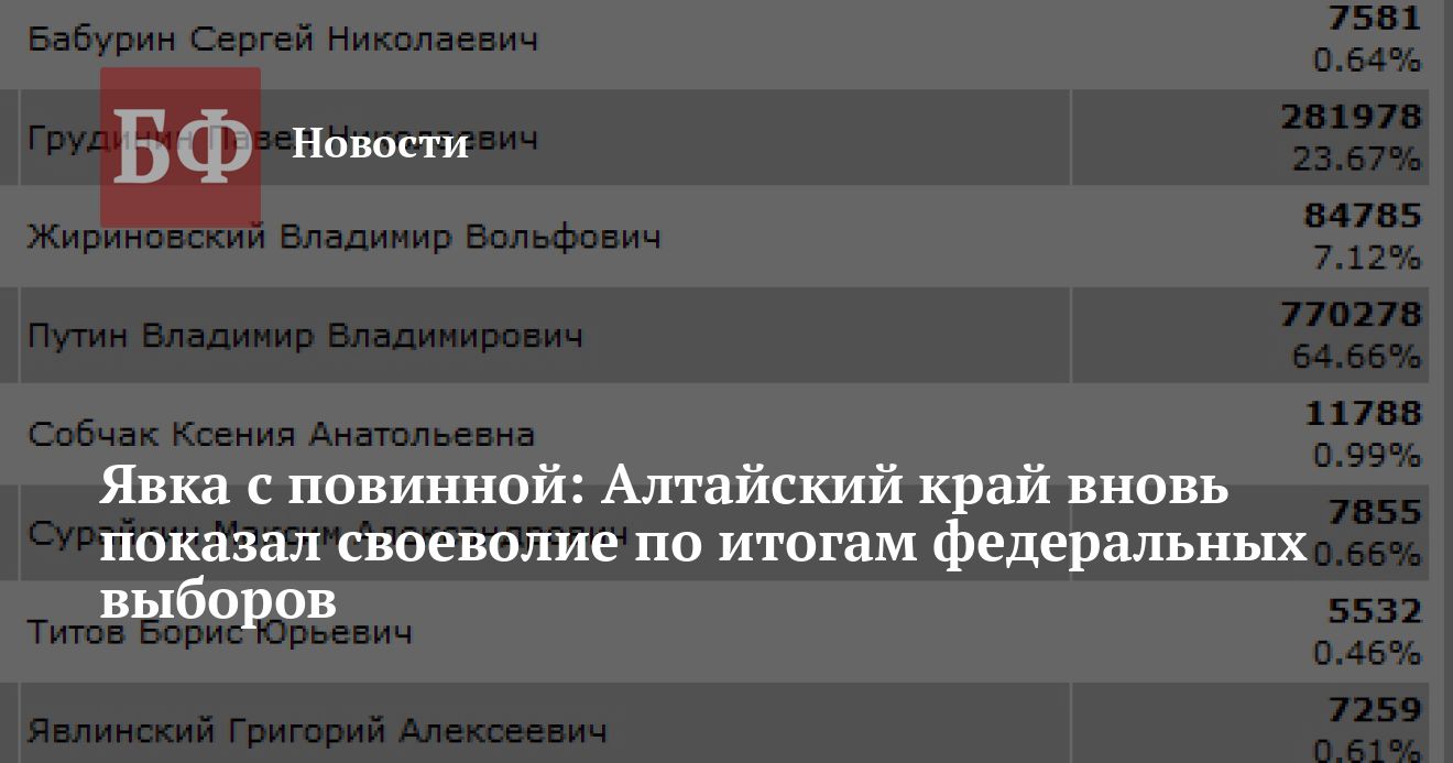 По информации, опубликованной на сайте ЦИК России, Владимир Путин набрал в Алтайском крае 64,66% голосов избирателей — за него проголосовало более 770 тысяч человек. Идущий на втором месте Павел Грудинин получил 23,67% голосов — это почти 282 тысячи человек. Эти значения показывают, что Алтайский край является одним из самых протестных к действующей власти регионов не просто в Сибири, но и во всей России. Так, результат Владимира Путина ниже только в Якутии (64,38%), результат Павла Грудинина выше также только в этом регионе (27,25%). В целом Владимир Путин на этих выборах набрал в Алтайском крае больше, чем на выборах 2012-го года, когда за него проголосовали 57,35% пришедших на участки избирателей. Это может говорить о том, что стратегия «Единой России» как главной движущей силы его кампании по мобилизации сторонников принесла плоды.