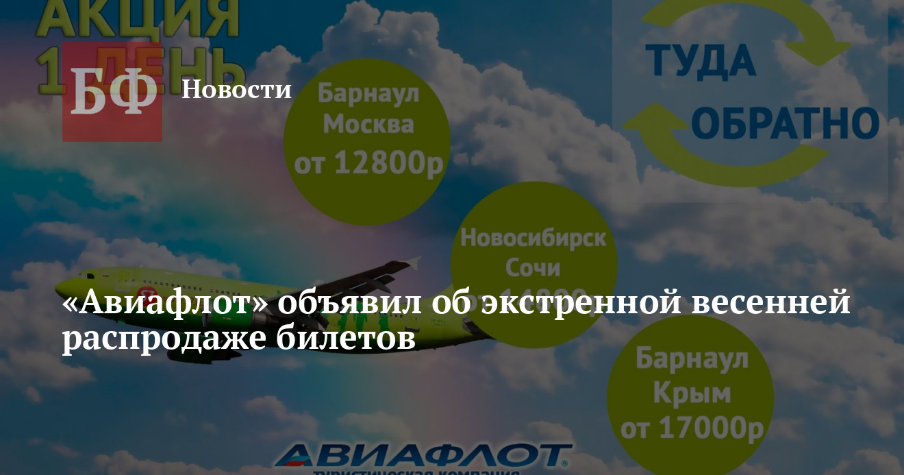Какой бы вид путешествия и страну вы не выбрали, забронировать авиабилеты в любую точку мира вам поможет компания «Авиафлот». Подробности по наличию мест и ценам на конкретные даты, вы можете по телефону (3852)22−66−66 или на сайте aviaflot.ru.
