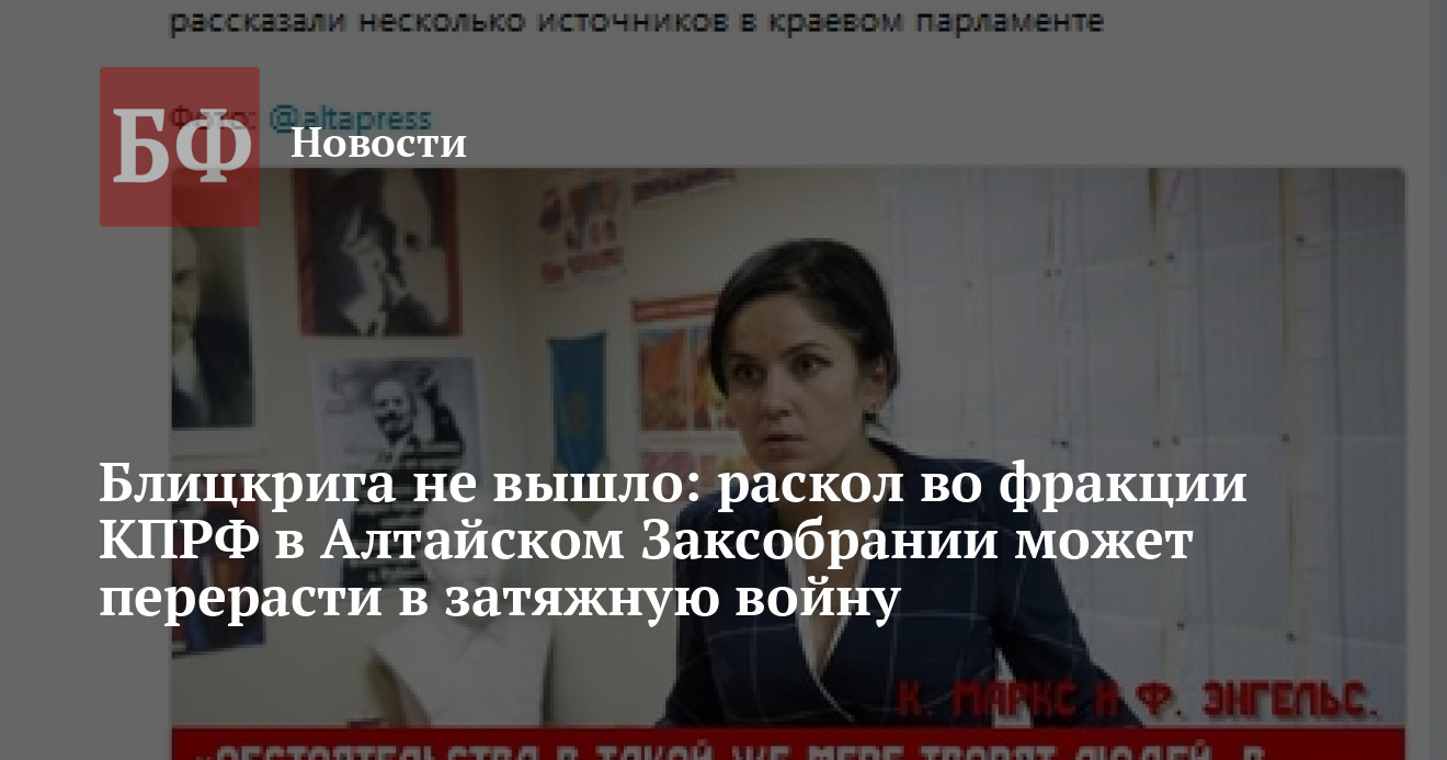 Сейчас многое зависит от позиции аппарата АКЗС. Пока похоже на то, что он действует в интересах группы «раскольников». Кроме того, в официальном Twitter реготделения «Единой России» в Алтайском крае уже появился довольно «злорадный» пост о смене руководства во фракции коммунистов. «Обстоятельства в такой же мере творят людей, в какой люди творят обстоятельства», — такой цитатой Карла Маркса сопроводили единороссы фотографию г-жи Прусаковой.