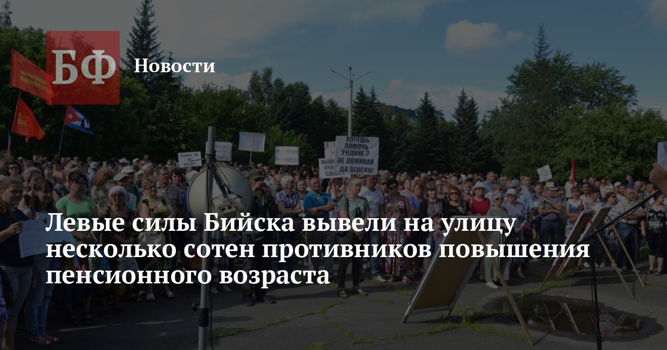 Левые оппозиционные силы Бийска 3 июля провели массовый митинг против повышения пенсионного возраста, который был анонсирован еще в середине июня. На него, по разным подсчетам, вышли в общей сложности 500−1000 человек с плакатами и транспарантами, главный лозунг которых можно сформулировать короткой фразой: «В гробу мы увидим эту пенсию». Несмотря на проблемы с местом, активисты считают, что акция была успешной.