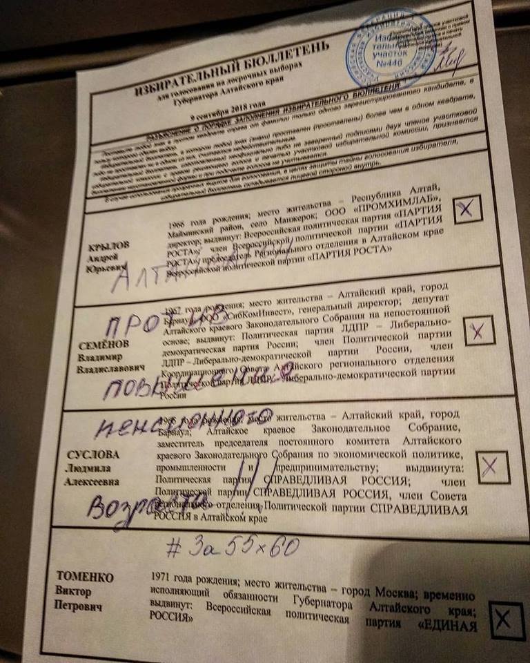 На избирательных участках продолжаются мини-перформансы. Так, коммунисты Новоалтайска пришли в помещение для голосования с красным флагом, и с ним же зашли в кабинку. Неизвестно, кому отдали голос представители КПРФ, которая не выставила своего кандидата. Возможно, они сделали на бюллетене надпись против повышения пенсионного возраста — такую акцию поддержали некоторые возмущенные жители Алтайского края. Добавим, что депутат АКЗС Сергей Писарев продолжил свои «полосатые приключения»: в зоопарк «Лесная сказка» приехал один из кандидатов, который решил пообщаться с народным избранником и погладить тигрят.