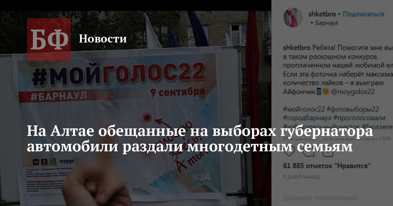 В Алтайском крае подвели итоги конкурса на лучшую фотографию во время выборов #Мойголос22. Как сообщили 14 сентября в эфире телеканала «Катунь 24», обладателями главных призов — новых автомобилей — стали многодетные семьи из Рубцовска, Барнаула и Бийска. Впрочем, были и такие участники, чьи снимки поддержало в Сети несколько десятков тысяч человек, однако им не досталось даже утешительных призов.