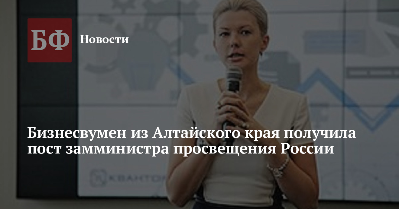35-летнюю уроженку Алтайского края, известного предпринимателя и гендиректора ФГАУ «Фонд новых форм развития образования» Марину Ракову назначили на должность заместителя министра просвещения России Ольги Васильевой. Соответствующее распоряжение 15 октября 2018 года подписал председатель правительства РФ Дмитрий Медведев.