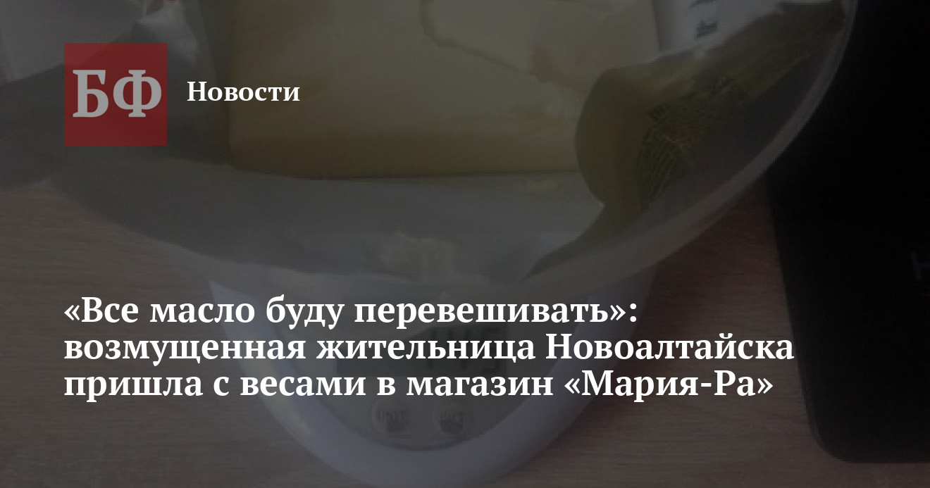 Своими наблюдениями поделилась жительница города Наталья Войцеховская в сообществе «Мамочки Новоалтайска» в «Одноклассниках». «Купила сейчас с утра сливочное масло в „Марии-Ра“, вместо положенных 170 граммов, указанных на упаковке, там всего 145. Никогда ничего не перевешиваю, а тут чувствую ну прям мало, легкая упаковка. Возвращаться не стала, так как далеко ехать, завтра специально поеду со своими весами, все масло буду перевешивать!» — написала она.