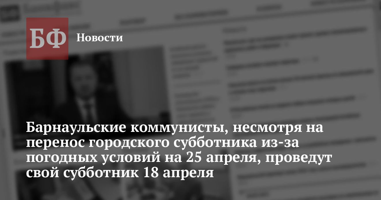 Об этом сообщил пресс-секретарь Алтайского краевого отделения Народно-патриотического союза России (АКО НПСР) Александр Кусиков. По его словам, барнаульские коммунисты, несмотря на погоду и решения местных властей, привыкли проводить Ленинские субботники в определенные дни апреля и в нынешнем году такой субботник пройдет 18 апреля (по традиции левых, субботник проводится в ближайшую субботу перед очередным днем рождения В.И. Ленина). В этот день члены горкома КПРФ и крайкома НПСР выйдут в парк на площади Октября (около Российско-американской школы), где расположен памятник Ленину, и проведут уборку этой территории. По словам Александра Кусикова, уже заказаны автобусы и инвентарь для уборки мусора из расчета на 150 человек. Кроме того, на площади будет установлена радиоустановка для поднятия трудового духа у участников субботника.