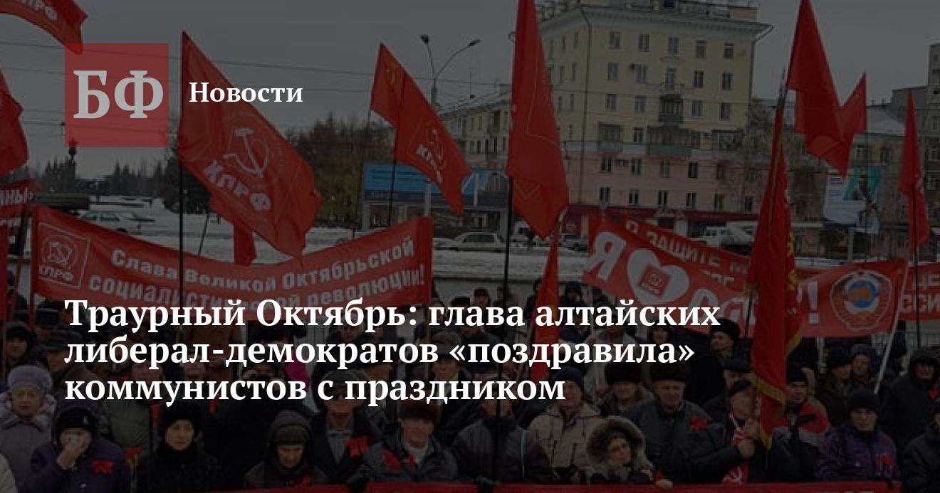 Лидер алтайских «жириновцев» Евгения Боровикова предложила объявить 7 ноября (годовщину Октябрьской революции) траурным днем. Праздником эту «кровавую дату нашей истории», по мнению координатора реготделения, могли сделать только варвары. Ее мнение приводится в сообщении партийной пресс-службы.
