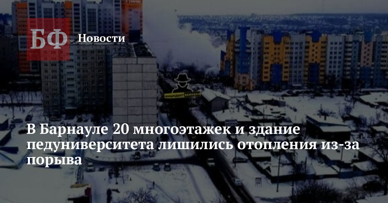 Утром 13 ноября специалисты «Барнаульской теплосетевой компании» обнаружили повреждение на тепловой сети в Железнодорожном районе города. По данным пресс-службы «Сибирской генерирующей компании», без отопления пока остается два десятка многоквартирных домов и один из корпусов Алтайского государственного педагогического университета, однако в ближайшее время проблема будет устранена.