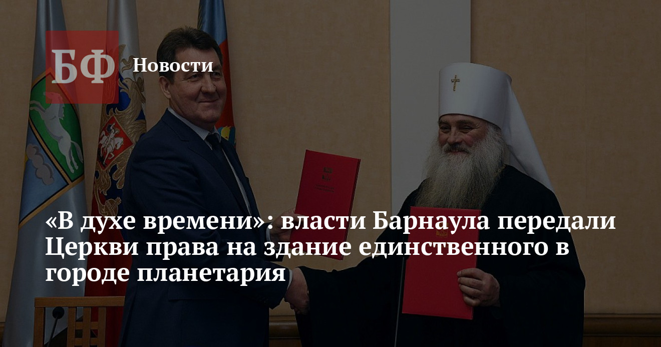 В барнаульской администрации состоялось подписание предварительного договора о безвозмездной передаче здания городского планетария местной епархии. Как отметил митрополит Барнаульский и алтайский Сергий, заключенный договор вполне соответствует духу времени. Об этом сообщается на офсайте Барнаула.