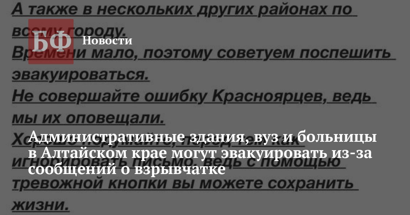 UPD: По сведениям «Бийского рабочего», в наукограде сообщения о минировании поступили более чем в 100 объектов. Среди них детские учреждения, больницы, а также и средства массовой информации. Угрозы в том числе получили Бийское телевидение и сама редакция «Бийского рабочего». В зданиях проводятся эвакуации. «Волна сообщений о минировании покатилась по городу, эвакуируют ряд школ, причем, судя по всему, они знают, какие на карантине, а какие нет. Эвакуировали администрацию города, администрацию Бийского района — она у нас в городе. Предварительно, около 100 учреждений уже [получили сообщения о минировании]», — пояснили ТАССу в горадминистрации.