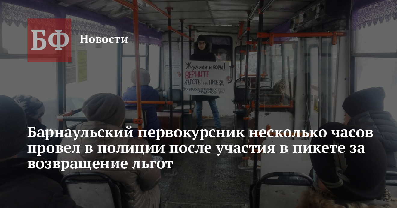20 февраля днем 18-летнего студента Алтайского госуниверситета Виктора Дряхлова прямо на занятиях настоятельно попросили проехать в полицейский участок. Поводом для длительной беседы с правоохранителями стало участие придерживающегося коммунистических взглядов первокурсника в акции против отмены льгот на проезд для малообеспеченных студентов. Об этом корреспонденту ИА «Банкфакс» рассказал один из организаторов протестного флешмоба, руководитель крайкома комсомола Антон Арцибашев. Он уверен, что таким образом представители власти хотят оказать давление на молодое поколение через показательные «репрессии».