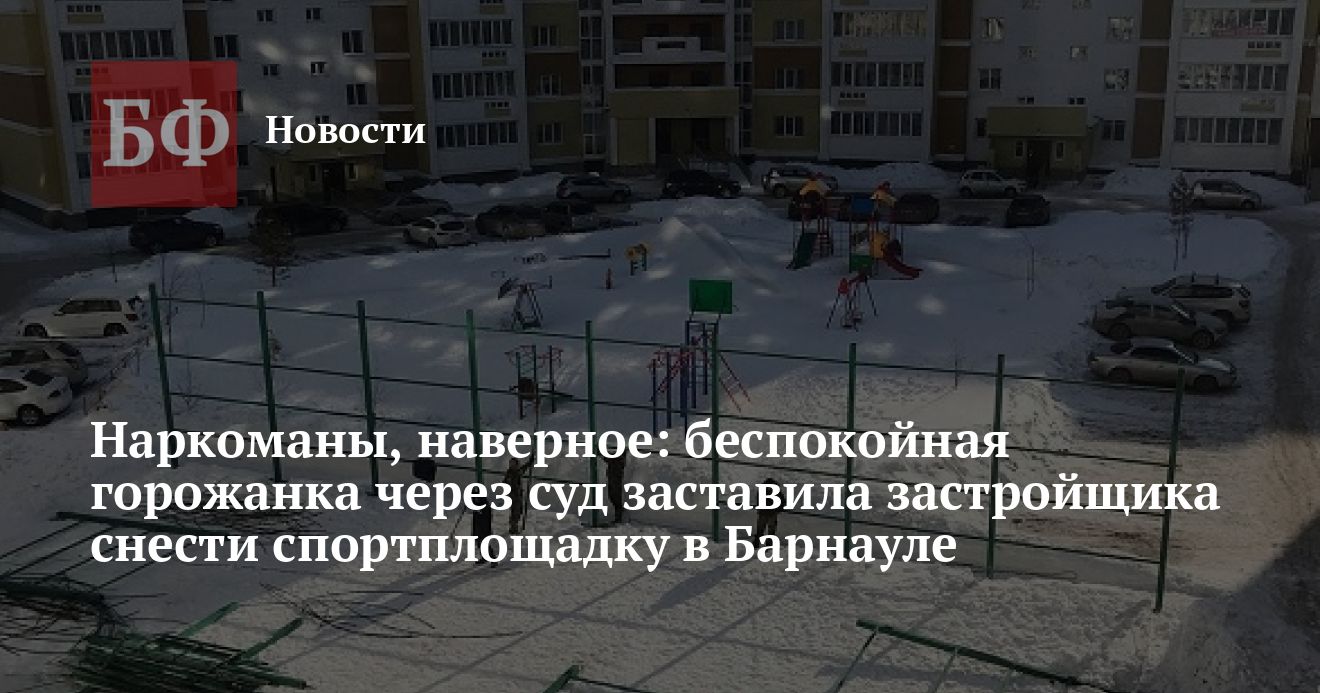 В Барнауле во дворе дома на Змеиногорском тракте, 104 «П"/5 застройщик снес ранее возведенную им же футбольно-баскетбольную площадку. К этому его вынудила активная жительница одного из близлежащих домов, которой почудились в играющих соседях агрессивные наркоманы и алкоголики, а постоянный стук мяча якобы посеял в ее душе чувство тревоги.