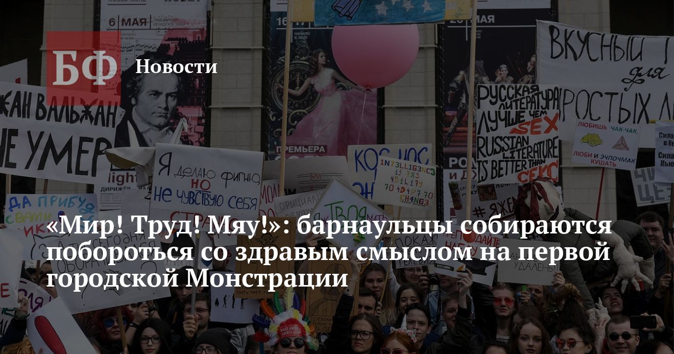 «Монстрация — почти что первомайская демонстрация. Но если по форме все то же самое: лозунги, шествие, плакаты, то по содержанию — прямо противоположное. Монстранты пропагандируют творческую активность, сами придумывают свои плакаты и даже костюмы. Их цель — победа не на выборах, а над здравым смыслом. 1 мая они выходят на улицу и скандируют не «Мир! Труд! Май!», а «Мир! Труд! Мяу!», — пишут организаторы Монстрации в Барнауле.