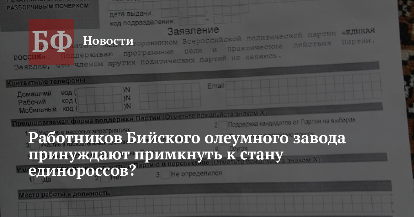 Руководство ФКП «Бийский олеумный завод» (БОЗ) в марте устроило на предприятии несколько политических «рейдов» с целью привлечения своих сотрудников в партию «Единая Россия». Рабочим предлагалось стать членами или сторонниками «партии власти», а в случае отказа им грозили лишением бонусов. Об этом стало известно реготделению партии «Коммунисты России», а позже ту же информацию ИА «Банкфакс» подтвердил один из работников БОЗ.