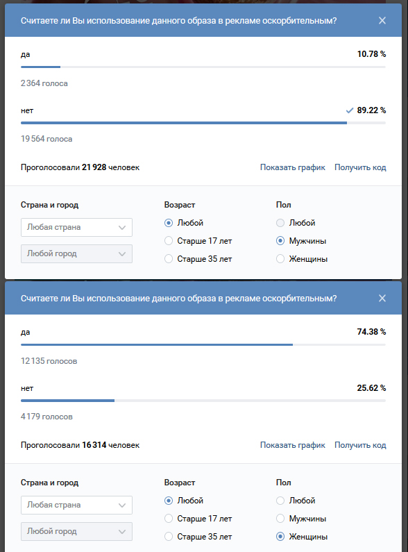 На данный момент большинство (62%) считает, что изображение женщины в образе БДСМ не является оскорбительным. Примечательно, что накануне результаты голосования были противоположными. Также интересно, что такая реклама оскорбляет в основном женщин — так проголосовали более 10 тысяч представительниц прекрасного пола в группе «ВКонтакте». Но мужское мнение оказалось более весомым — около 17 тысяч мужчин посчитали, что ничего оскорбительного в этом нет. В то же время с обеих сторон есть и «перебежчики». Так, более двух тысяч мужчин поддержали наиболее популярное среди девушек мнение об оскорбительности, и более 3,5 тысяч женщин не нашли ничего плохого в этом изображении. Всего в соцсетях проголосовало уже более 33 тысяч человек. Из них почти 7 тысяч из Москвы и Санкт-Петербурга. К сожалению, статистика по другим регионам «ВКонтакте» недоступна.