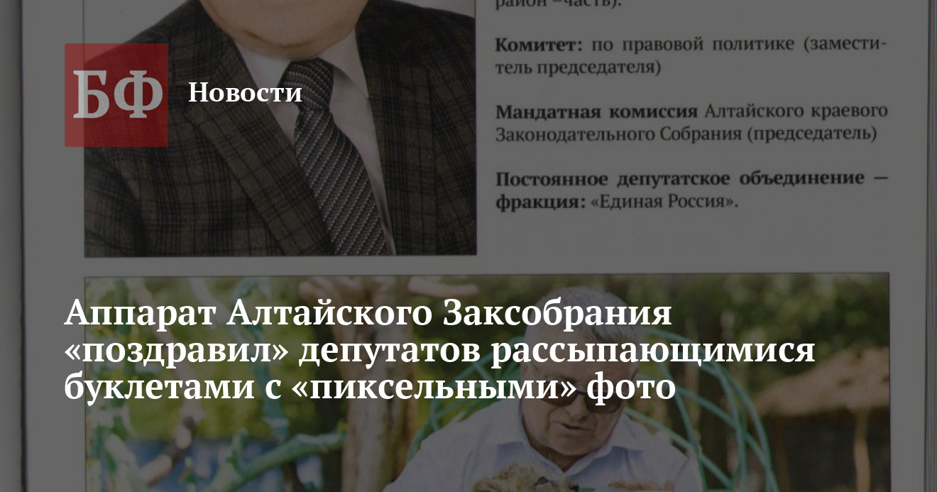 Повод вспомнить и обсудить депутатов действительно нашелся, но не самый позитивный. Многие фото в буклете на 136 страниц, пока изданном тиражом в 100 экземпляров, очень плохого качества и низкого разрешения, часть из них, возможно, являются простыми скриншотами с видео. Другие просто вызывают вопросы в связи с несуразной композицией или изображенными на них событиями. Кроме того, буклет плохо сшит и поэтому, очевидно, недолговечен, так что вряд ли сможет полноценно исполнить свою «мемориальную» функцию. Как указано в выходных данных, печатало сборник КГБУ «Типография управления делами администрации Алтайского края».