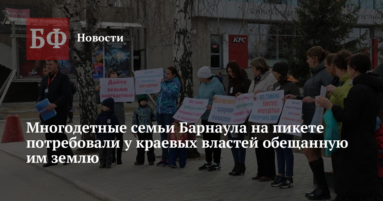 В центре Барнаула у кинотеатра «Мир» состоялся массовый пикет многодетных семей, которые уже потеряли всякую надежду на положенные им по закону земельные участки. По их словам, очередь на землю в последнее время только растет, а заветные «квадраты» за последние годы получили лишь единицы. Об этом сообщают активисты «Гражданского патруля».
