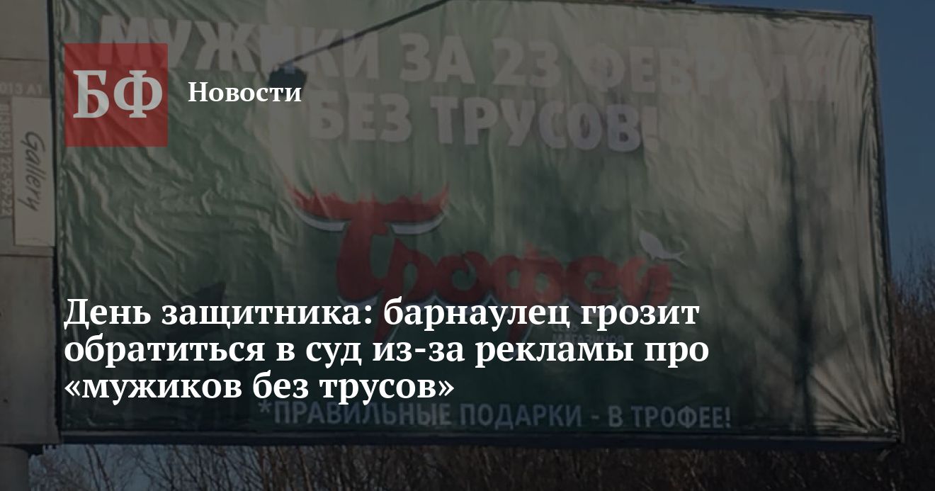 Барнаулец считает, что реклама сети магазинов «Трофей», размещенная на нескольких биллбордах в городе, похабна, оскорбительна и унижает достоинство человека. Вадим Жигульский, буквально понявший слоган «Мужики за 23 февраля без трусов», считает, что он является аморальным призывом и приносит моральные страдания детям и взрослым воспитанным людям.
