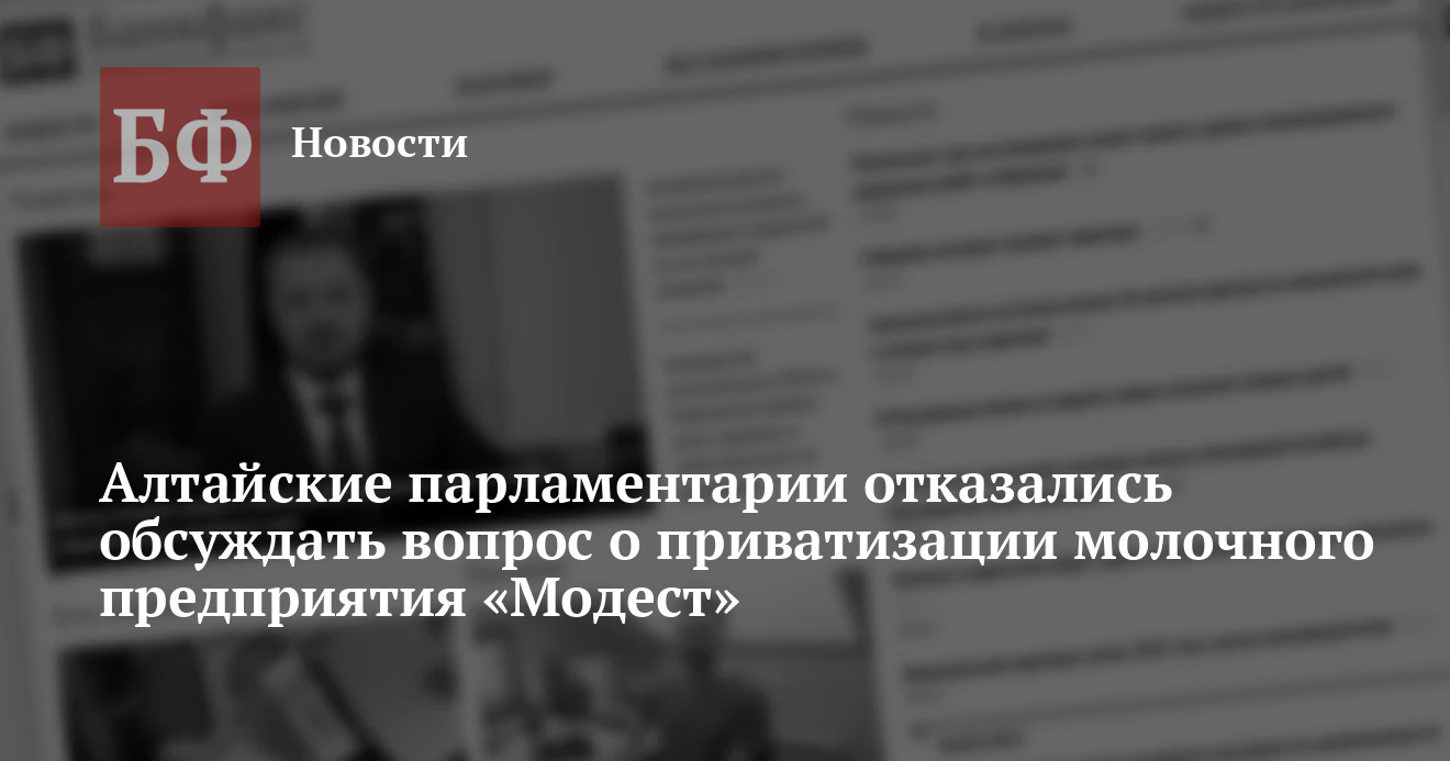 Добавим, что 16 апреля оппозиционные фракции в Алтайском Заксобрании заявляли, что собираются выступить против внесения в план приватизации краевого госимущества на 2018−2020 годы краевого АО «Модест». Публично в этом ключе высказались коммунисты и справедливороссы, поделившиеся своими опасениями, что кому-то либо понадобилась земля под предприятием, либо же кто-то захотел «прибрать к рукам» выгодное производство в ущерб качеству. Позже представитель реготделения ЛДПР тоже подтвердил ИА «Банкфакс», что их фракция в АКЗС выступает против продажи.