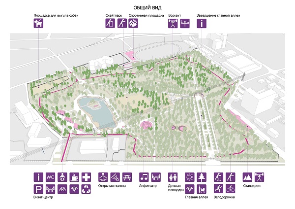 Второй проект, подготовленный при участии бывшего арендатора «Изумрудного» Павла Тулина, представила управляющий партнер Центра консалтинга и бизнес-образования «Системы Роста» Вероника Базилевская. Эта концепция бизнес-парка предполагает куда более радикальные изменения и возведение целого ряда объектов. Как отметила Базилевская, базисом новой концепции станет именно активный всесезонный отдых с определенной событийностью. Момент, на который живо обратили внимание присутствовавшие — это наполнение «Изумрудного». На его территории должны появиться летний бассейн, коворкинг для молодых предпринимателей, пара небольших кофеен, новое здание для планетария, лекторий, летний кинотеатр, одно полноценное всесезонное кафе, детские площадки и спортивный комплекс, площадью 12 тысяч кв. м. Все это должно уместиться на территории, свободной от захоронений, то есть, как отметила Вероника Базилевская, на 0,74 га, или 6% площади «Изумрудного». Вся инфраструктура, как видно из плана, должна разместиться у зоны центрального входа.