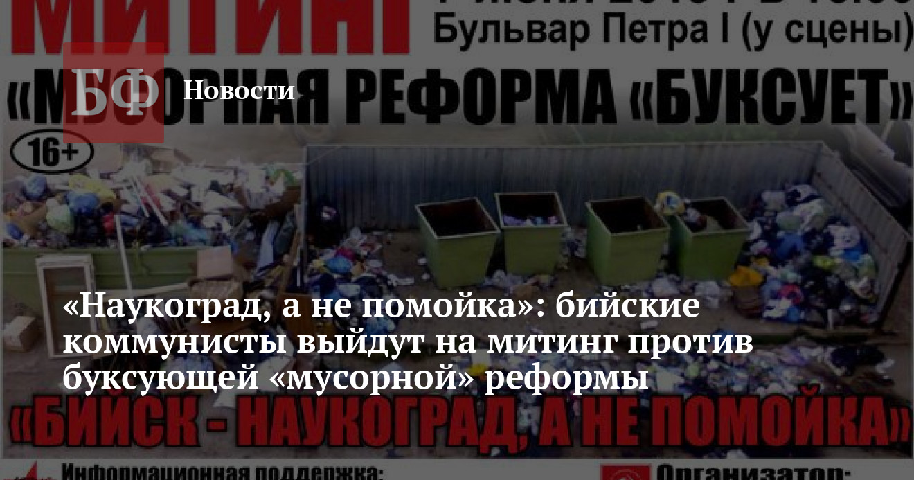 7 июня в 16:00 в центре Бийска члены городского комитета КПРФ проведут митинг «Мусорная реформа буксует» с целью привлечения внимания к свалкам, которыми за последние месяцы «оброс» наукоград. Как рассказал ИА «Банкфакс» персек Бийского горкома КПРФ Вячеслав Початов, коммунисты планируют собрать под красными стягами не менее 500 человек с активной гражданской позицией, которым надоело наблюдать, как город превращается в помойку. Активисты намерены потребовать от властей решить ситуацию тем или иным способом.