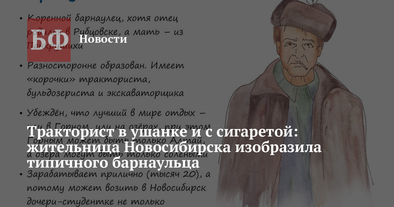 Далее они оценивают его интеллектуальные способности, говоря о «разносторонней образованности», очевидно, с сарказмом. Как следует из описания, типичный житель Барнаула пригоден для управления сельхоз- и строительной техникой, ходит в шапке-ушанке и сигаретой в зубах. Зарабатывает он, соответственно, «прилично — тысяч 20» [рублей]. Этими деньгами барнаулец помогает своей абстрактной дочери-студентке, которая учится в Новосибирске. Представление об отдыхе у такого человека сообразно его кругозору: отдыхает он только в Горном-Алтае или на соленых озерах.