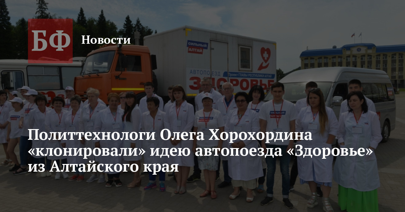 Проект «Автопоезд «Здоровье» начал свою работу в Республике Алтай, старт ему дал врио главы региона Олег Хорохордин. Несмотря на социальный характер акции, в соцсетях его называют политическим: так его охарактеризовал в том числе известный в Алтайском крае политтехнолог Андрей Клюзов, который прозрачно намекнул, что автопоезд приурочен к конкретному событию, но может стать постоянным. Он же в свое время был одним из инициаторов аналогичных проектов в других регионах России.