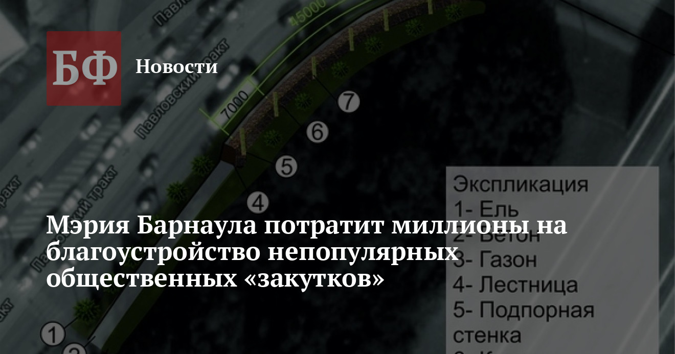 Работы в зеленом уголке на пересечении Павловского тракта и проспекта Строителей предполагают выкорчевывание восьми деревьев и пяти кустарников, тогда как посадить планируется лишь шесть елей. Однако восстановление баланса зелени в проекте все же предусмотрено за счет посадки 90 кустов кизильника блестящего, который используется для создания живой изгороди. Таким образом будет создано что-то вроде сквера с фонарями и тротуарной плиткой. При этом не совсем понятно, зачем это нужно делать именно здесь — на одном из самых загруженных трафиком перекрестков в городе.