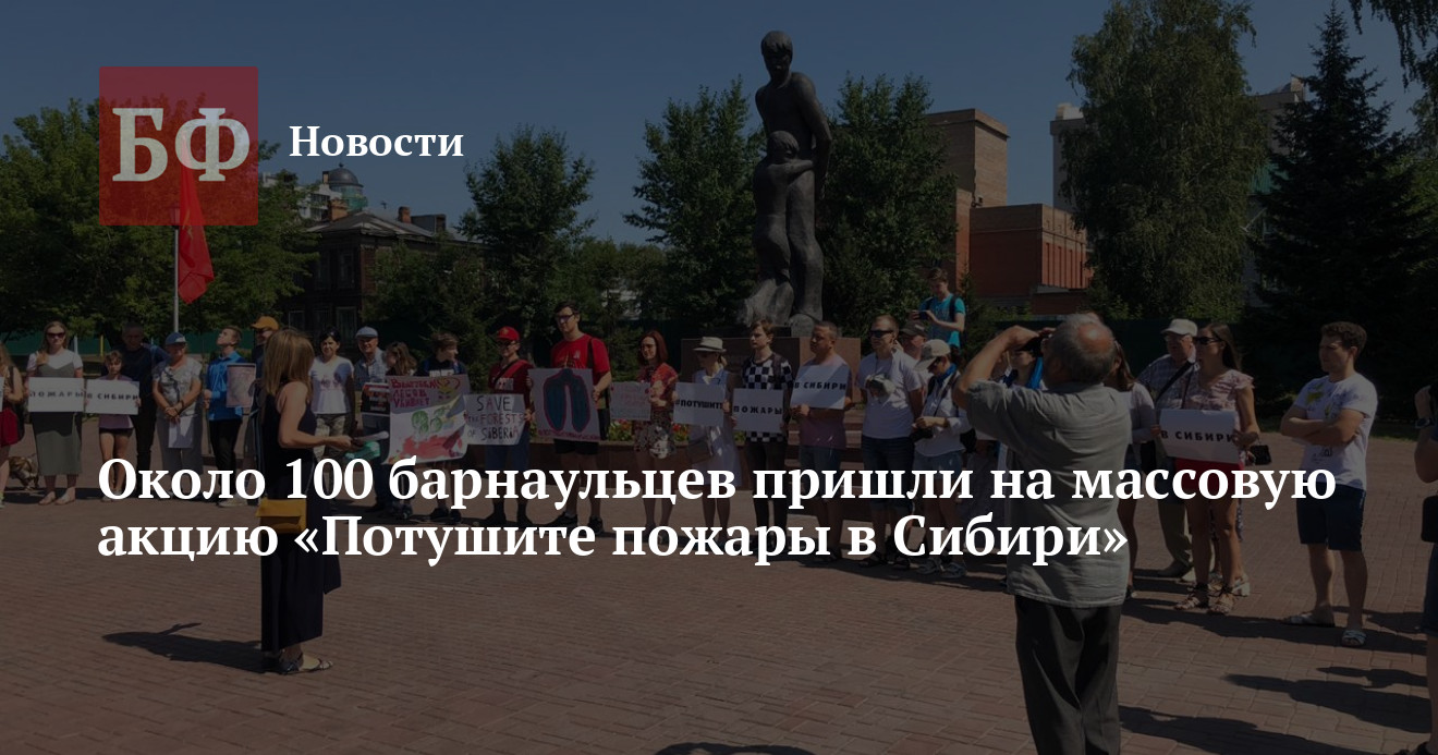 Массовая акция прошла в гайд-парке на площади Свободы в Барнауле. Анастасия Соболева сообщила корреспонденту ИА «Банкфакс», что в пикете приняли участие около 100 человек — это максимальное число граждан, допустимое для акций без согласования. Многие пришли с плакатами, призывающими власти к активным действиям и поднимающими тему сохранения природы. Вероятно, людей могло бы быть еще больше, но как раз за несколько дней до пикета власти наконец начали принимать меры, задействовали авиацию, так что волна массового недовольства понемногу начала спадать.