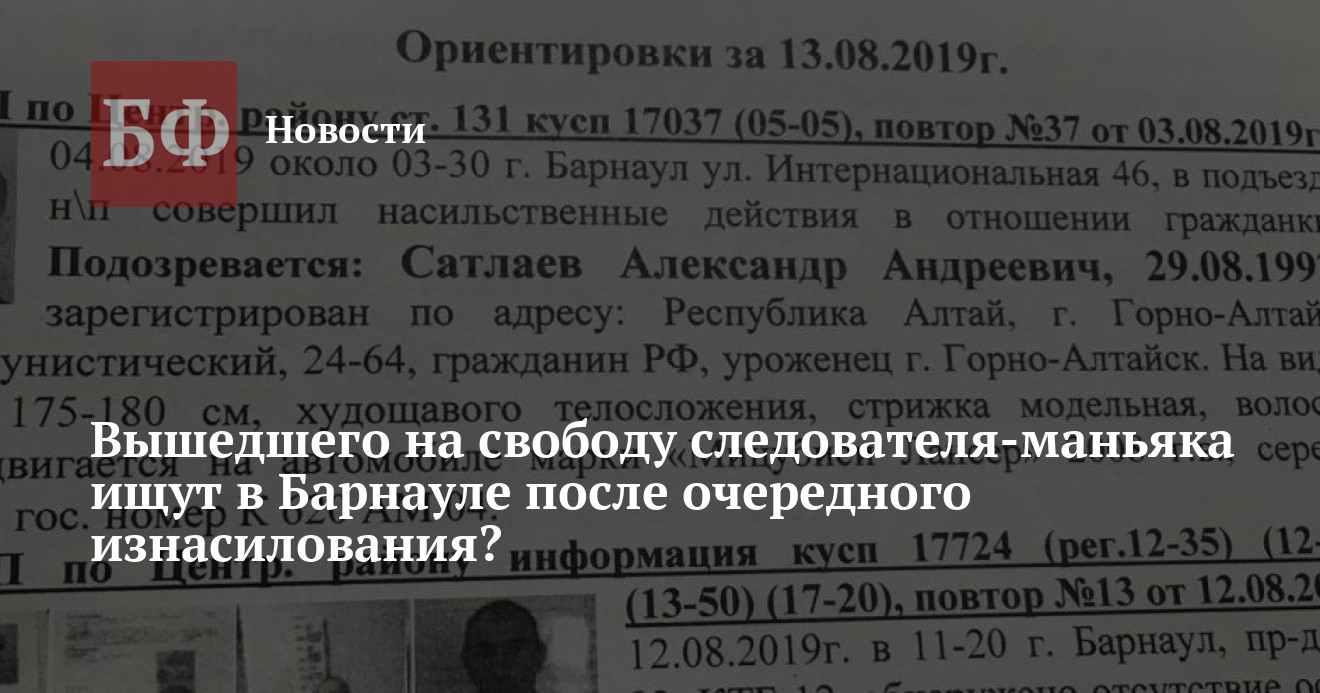 Как следует из растиражированной ориентировки, жительница Барнаула была изнасилована ночью 4 августа в подъезде многоквартирного дома по адресу улица Интернациональная, 46. В совершении преступления по ст. 131 УК РФ (изнасилование) предварительно подозревают 26-летнего уроженца Горно-Алтайска Александра Сатлаева, приметы которого полностью совпадают с наружностью осужденного ранее следователя. На вид ему 30 лет, имеет рост 175−180 см, худощавое телосложение, русые волосы. В полицейской ориентировки также было указано, что Сатлаев передвигается на серебристом автомобиле Mitsubishi Lancer 2008 года выпуска с госномерами «К620АМ 04».