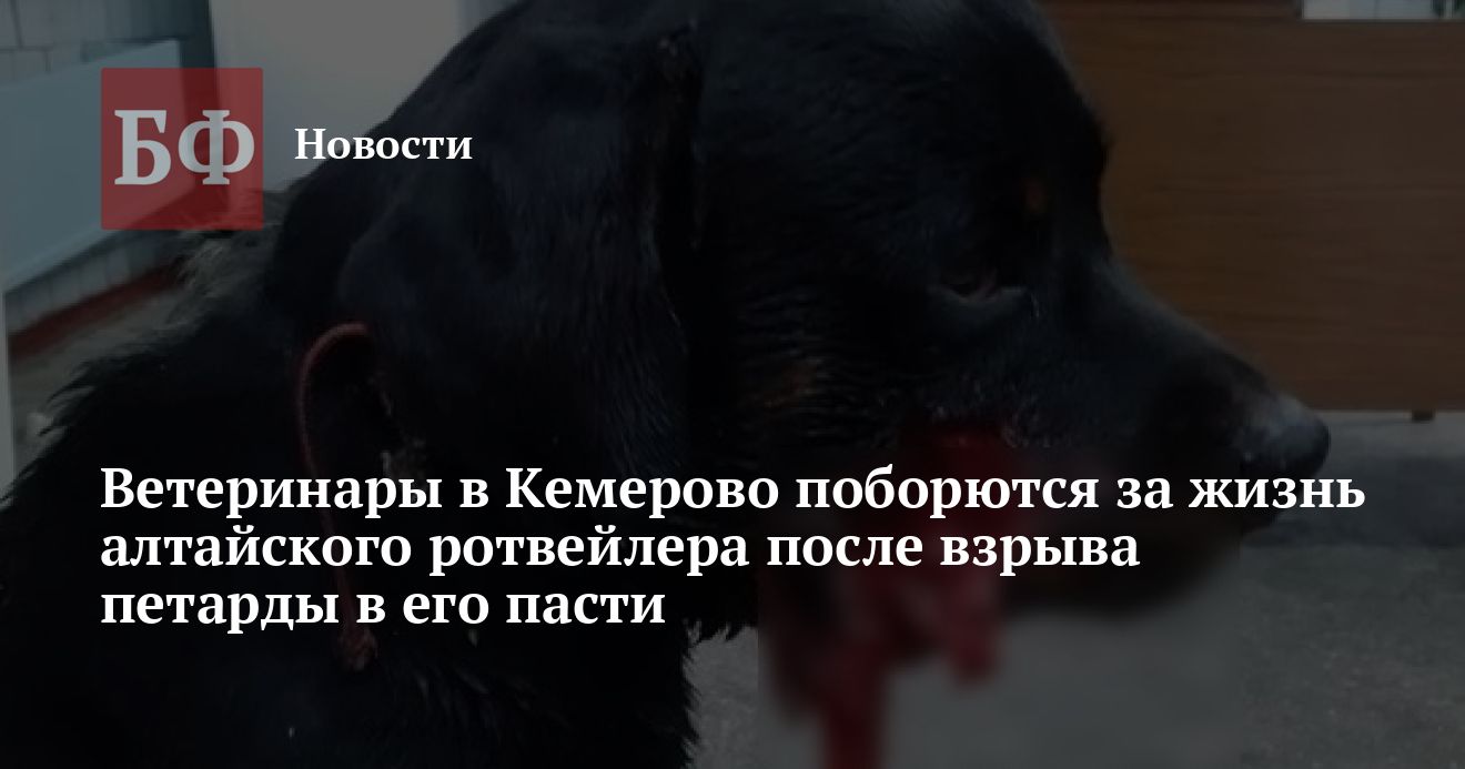 Алтайские волонтеры обратились за помощью к кемеровским зоозащитникам с просьбой принять для лечения и реабилитации ротвейлера, который попал к ним с тяжелейшими травмами. Как сообщает «Московский комсомолец — Кузбасс», у собаки вываливается правая щека, предположительно, после взорванной в пасти петарды, а на теле обнаружены многочисленные рваные раны.