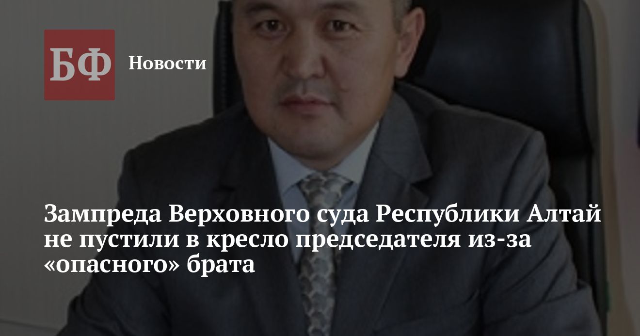 16 сентября Высшая квалификационная коллегия судей РФ провела очередную сессию, в ходе которой в числе прочих был рассмотрен вопрос — рекомендовать ли Валерия Сарбашева на пост председателя Верховного суда Республики Алтай. В результате рассмотрения он был решен не в пользу кандидата, сообщает правовой портал. Как выяснилось, причиной отказа стало наличие у Сарбашева брата-правонарушителя. По сведениям ИА «Банкфакс», речь может идти о главе Шебалинского района РА и лидере местного отделения единороссов Эрчиме Сарбашеве.
