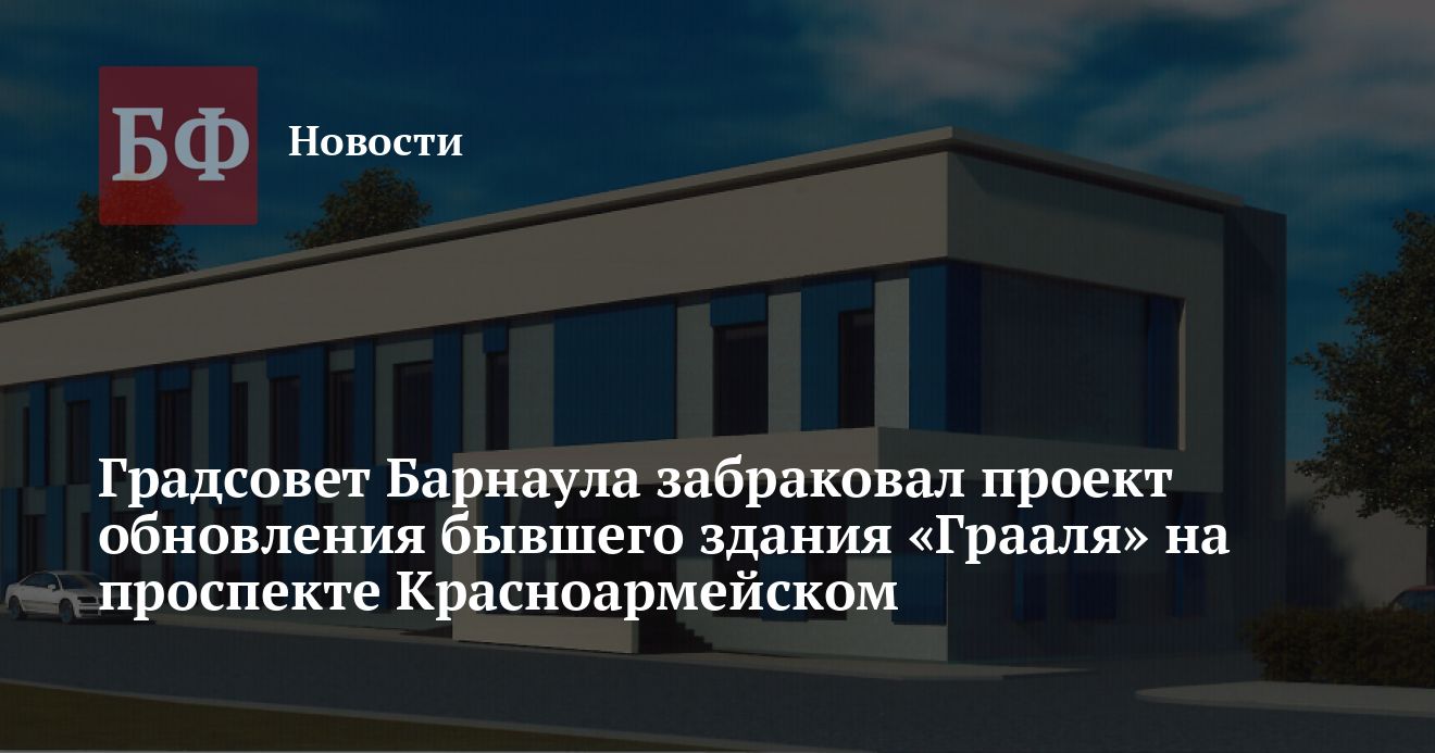 Градостроительный совет Барнаула отклонил эскизный проект реконструкции здания на Красноармейском проспекте, 26, где некогда располагался торговый центр «Грааль». Давно нуждающееся в ремонте и задрапированное фальш-фасадом здание решил обновить его новый собственник, но получил отказ от Градсовета. В то же время этот орган одобрил проект строительства очередного ТЦ в западной части города. Об этом сообщает «Алтайский портал недвижимости».