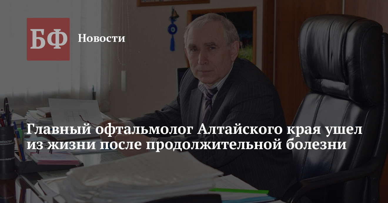 13 октября в Барнауле на 67-м году жизни скончался главврач Алтайской краевой офтальмологической больницы, главный офтальмолог региона Александр Репин. Данную информацию ИА «Банкфакс» подтвердили в пресс-службе алтайского Минздрава.