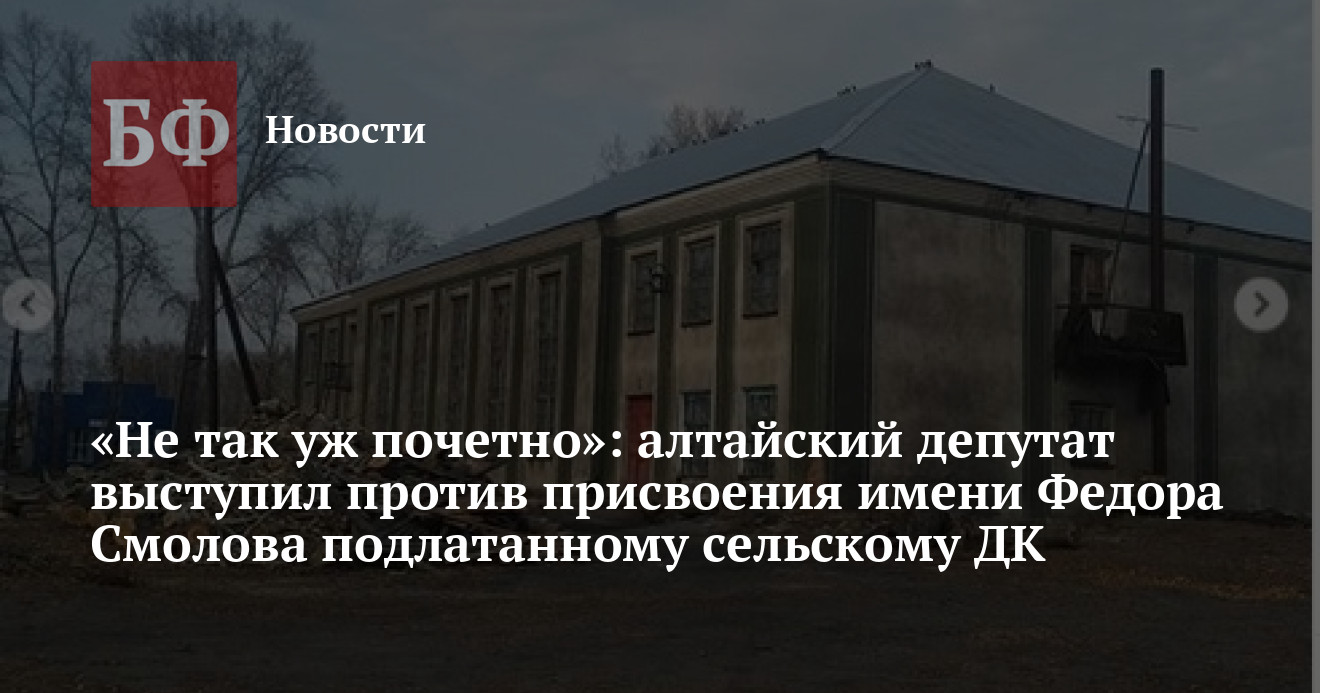 15 октября организаторы сбора средств на ремонт Дома культуры в селе Костин Лог Мамонтовского района сообщили в Сети, что строителями был закручен последний саморез в новую крышу. Теперь они намерены отблагодарить всех тех, кто помог деньгами, а также связаться с выделившим основную сумму футболистом сборной России Федором Смоловым, чтобы обсудить процедуру присвоения ДК его имени. Депутаты райсовета готовы рассмотреть данный вопрос в ходе очередной сессии, сообщил ИА «Банкфакс» один из народных избранников Евгений Киселев. Впрочем, он сам считает, что учреждение нужно оставить без какого-либо имени, и надеяться, что оно не разрушится в ближайшие 10 лет.