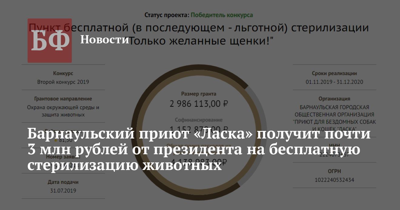 Барнаульский приют для животных «Ласка» выиграл президентский грант в размере 2,9 млн рублей на реализацию своего проекта по созданию пункта стерилизации животных «Только желанные щенки!» Согласно описанию проекта, опубликованному на сайте Фонда президентских грантов, операции поначалу будут бесплатными, но со временем за нее все же станут брать деньги.