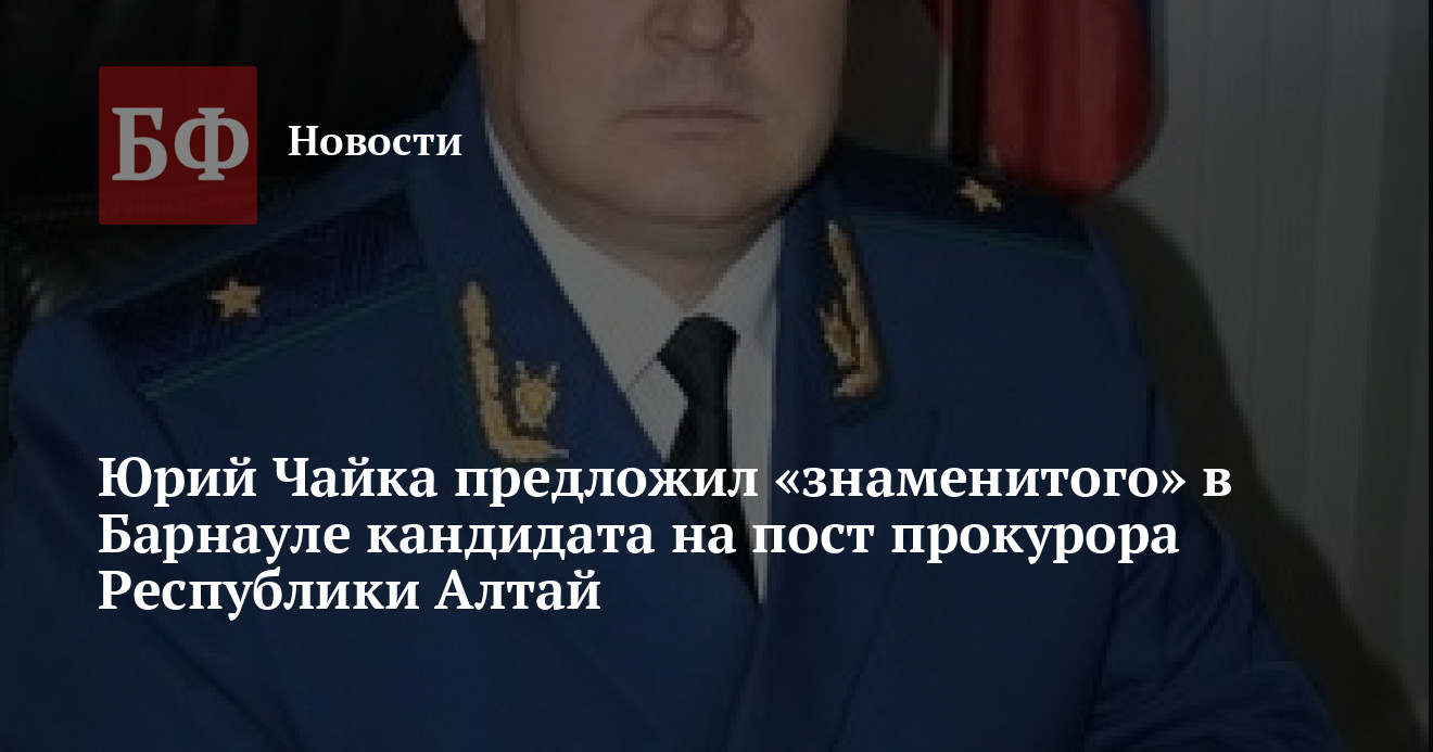 Генеральная прокуратура РФ направила председателю Госсобрания Республики Алтай Владимиру Тюлентину обращение с просьбой согласовать назначение нового руководителя надзорного ведомства региона вместо 64-летнего Николая Мылицына. По предложению Юрия Чайки претендентом на должность стал хорошо известный в «двух Алтаях» Анатолий Богданчиков, следует из документа (копия имеется в распоряжении ИА «Банкфакс»).