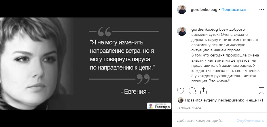 Поздно вечером 31 октября Гордиенко опубликовала комментарий к ситуации в своем аккаунте в Instagram. По словам чиновницы, ей было очень сложно несколько дней «держать паузу» и ничего не комментировать. Теперь же она прояснила ситуацию и своим комментарием дала понять, что в деле замешаны некие третьи силы. «В том что сегодня произошла смена власти — нет вины ни депутатов, ни представителей администрации. У каждого человека есть свое мнение, а у каждого руководителя — четкая позиция. Это жизнь!» — указала Гордиенко, фактически признав возложение обязанностей руководителя муниципалитета на замглавы Алексея Жихаренко.