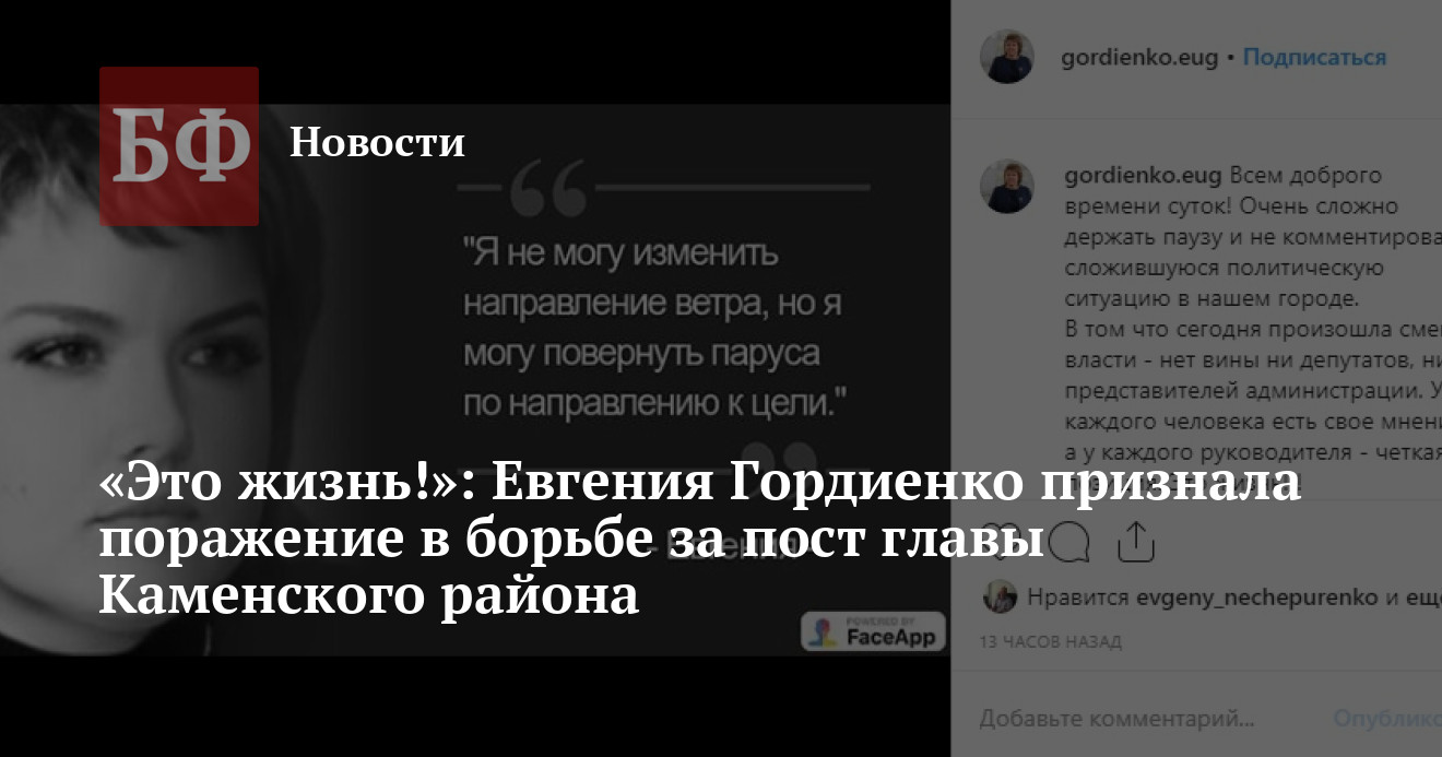 Бывшая и.о. главы поблагодарила всех, кто поддерживал ее на посту и заверила, что продолжит трудиться в интересах жителей Каменского района. «Поверьте, меня не пугают трудности! Я работала, работаю и буду работать на благо жителей нашего замечательного района! Все те положительные изменения, которые сегодня происходят — это и ваша заслуга! Советы, напутствия, рекомендации, а порой и критика помогают принимать правильные решения и достигать хороших результатов», — написала Гордиенко.