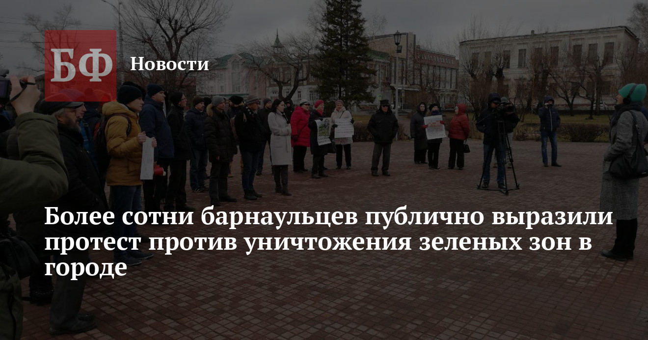 9 ноября днем в краевом центре состоялся митинг «За сохранение и развитие „зеленых зон“ Барнаула». В нем приняли участие более сотни человек, которые по окончании акции протеста подписали резолюцию, направленную губернатору Алтайского края Виктору Томенко, депутатам, администрации города и ректору Алтайского государственного университета Сергею Бочарову, сообщила одна из активисток, организатор акции Татьяна Труфанова «ВКонтакте».