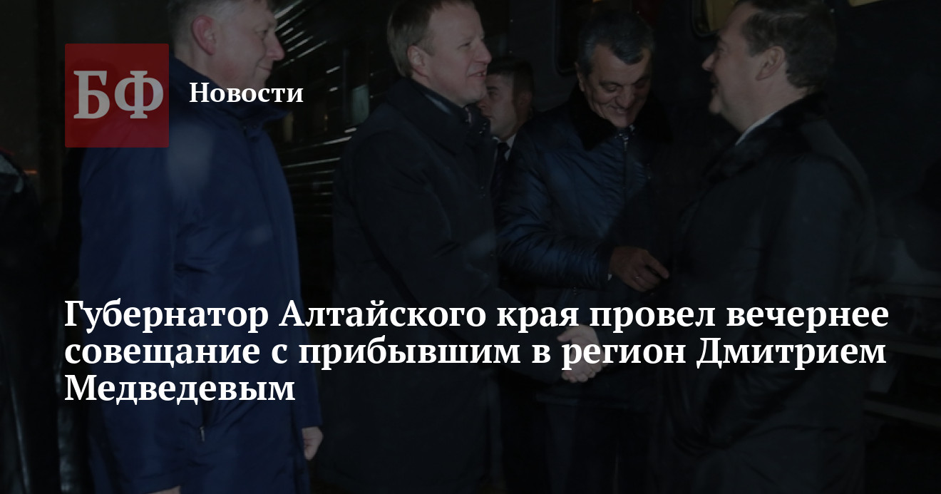 12 ноября около 20:00 в Барнаул на поезде из Новосибирска прибыл председатель правительства РФ Дмитрий Медведев. Столичного гостя, как водится, встречали высокопоставленные лица региона, а также 10-балльные пробки на проезжей части из-за перекрытых дорог и обильного снегопада. В тот же день премьер-министра отвезли в санаторий «Обь», где у него состоялась рабочая встреча с губернатором Алтайского края Виктором Томенко. Как сказано на сайте алтайского правительства, речь шла о реализации 52 национальных проектов на территории региона.