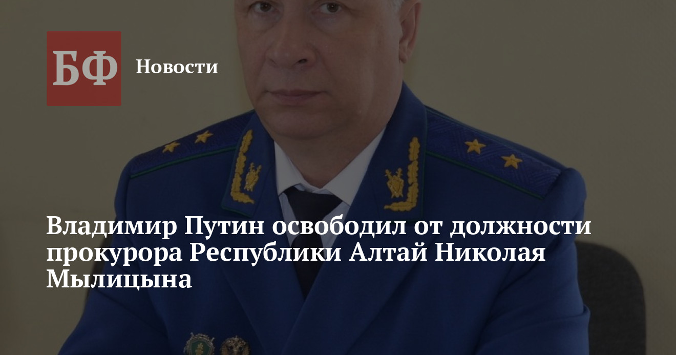 По указу президента прокурор Республики Алтай Николай Мылицын освобожден от занимаемой должности. Об этом сообщается на сайте Генпрокуратуры РФ. Ранее Госсобрание Эл Курултай уже согласовало на место руководителя надзорного ведомства региона кандидатуру хорошо известного в «двух Алтаях» Анатолия Богданчикова.