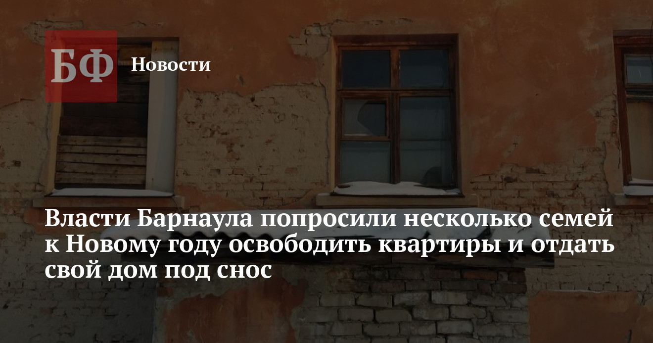Шесть семей, проживающих в двухэтажке на улице 2-й Строительной, 46 в Барнауле, написали коллективную жалобу в прокуратуру Железнодорожного района города. Граждане требуют привлечь к ответственности администрацию краевого центра, которая пытается выселить их из жилого помещения прямо в канун Нового года и рекомендует найти себе новый кров, рассказала ИА «Банкфакс» одна из активисток Светлана Дроздова. Как заявили жильцам чиновники, аварийный дом, в котором они проживают, нужно успеть снести до 31 декабря 2019 года.