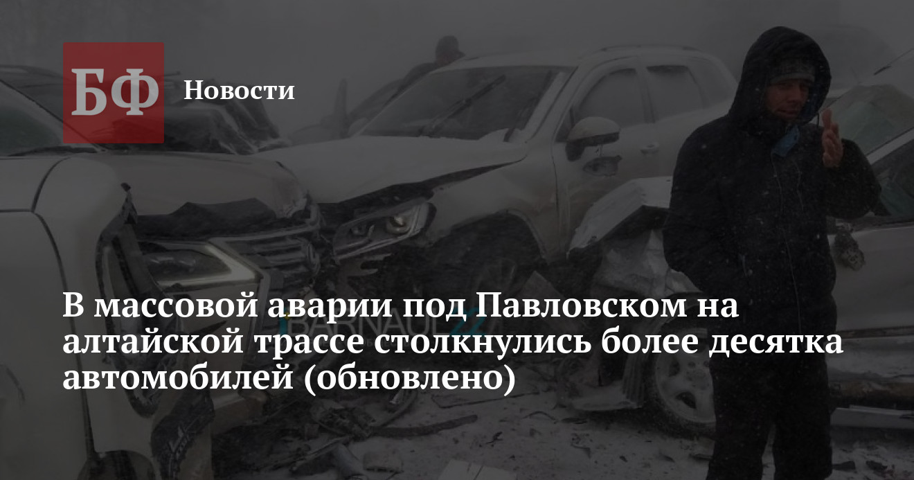 Авария произошла в разгар снежного шторма, который накрыл большую часть Алтайского края. Согласно сообщениям очевидцев, столкновение произошло примерно в 14:40 в 12 км от Павловска. По их подсчетам, на трассе столкнулись 12 автомобилей. По предварительной информации, есть погибшие и раненые. На месте работают сотрудники ГИБДД и ГУ МВД по Алтайскому краю, сейчас информация о происшествии уточняется.