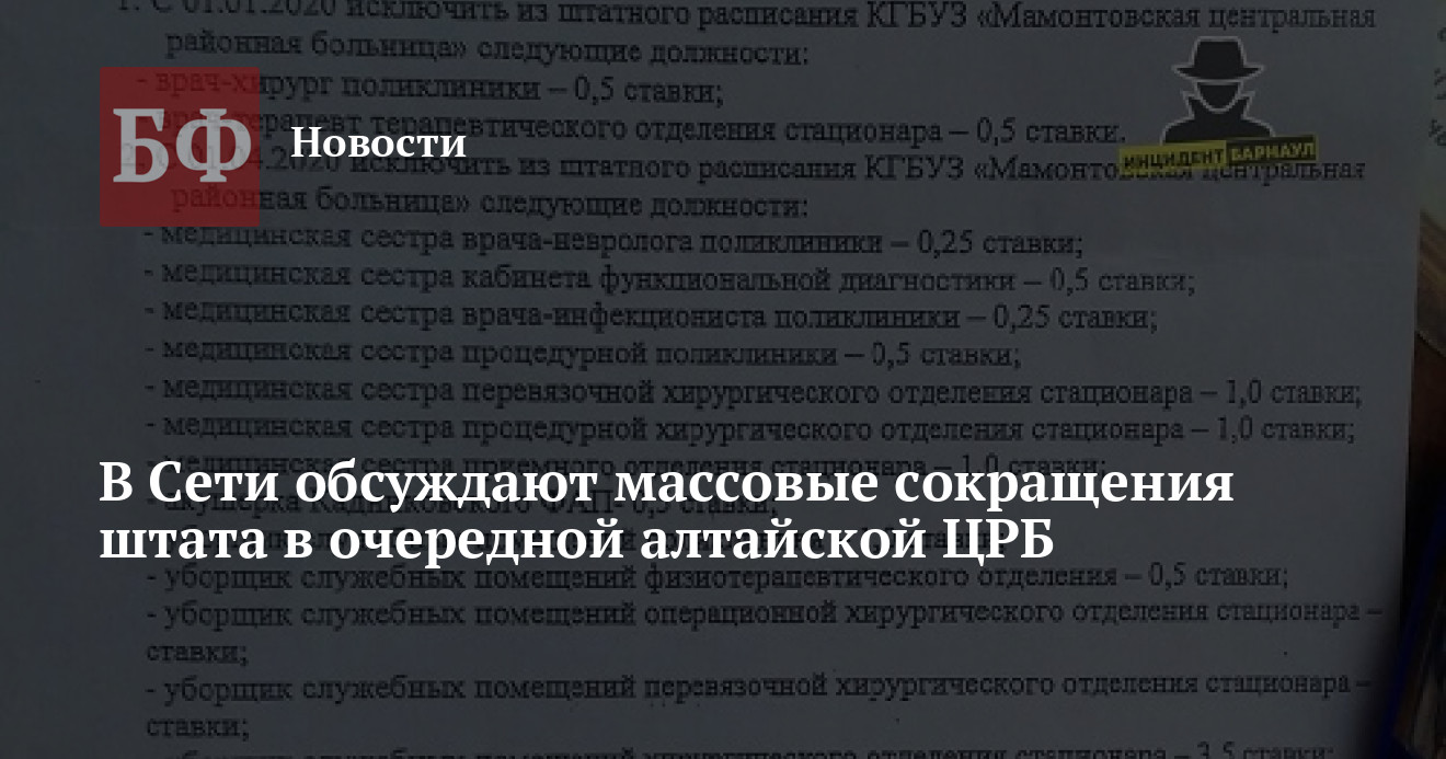 24 января участники сообщества «Инцидент Барнаул» «ВКонтакте» активно высказывали свое недовольство по поводу очередных мер оптимизации в сфере здравоохранения. Судя по опубликованному документу, на сей раз они коснулись Мамонтовской ЦРБ, где с 1 января 2020 года были сокращены сразу несколько ставок санитарок и медсестер, а также существенно урезаны рабочие часы некоторых врачей. Жители региона заявили, что такие шаги Минздрава скоро приведут к новому оттоку профессионалов из медицины.