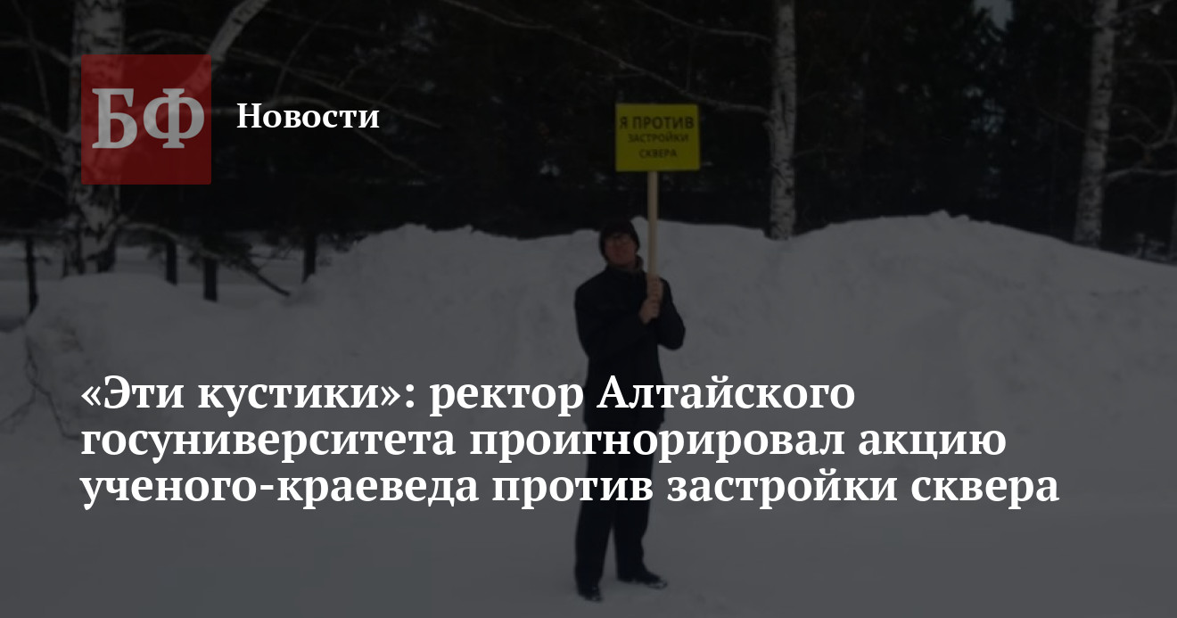 Любопытно, что 28 января, аккурат накануне акции краеведа на сайте ИА «Амител» было опубликовано интервью с ректором Сергеем Бочаровым. В нем он красноречиво обозначил свое отношение к скверу. «А эти кустики, о которых все говорят, что они нужны, используются в основном… ну сами понимаете… для физиологических нужд. Не профильных», — с улыбкой заявил Бочаров.
