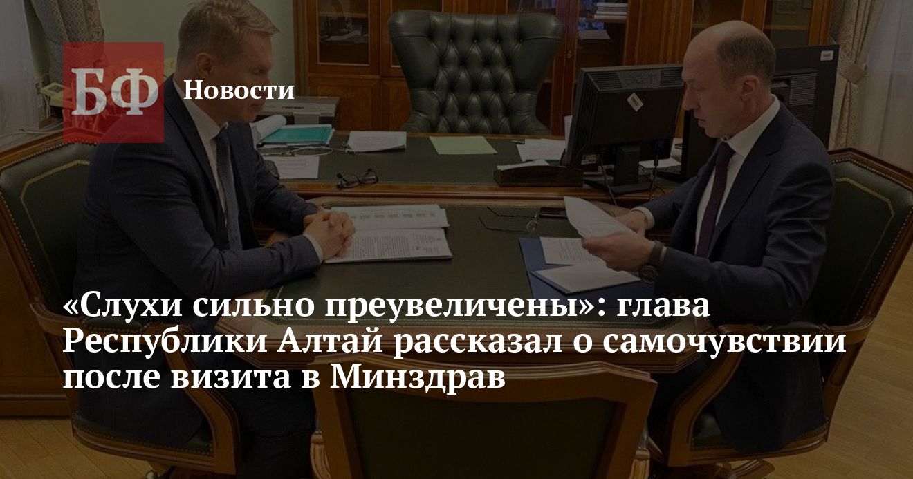 30 января губернатор Республики Алтай Олег Хорохордин опубликовал в Instagram пост, в котором попытался развеять все домыслы относительно ухудшения состояния своего здоровья. Он заявил, что ситуация на самом деле не так критична, как об этом сообщили некоторые Telegram-каналы и СМИ, что он уже пошел на поправку и даже активно включился в рабочий процесс. В доказательство он продемонстрировал фото с рабочей встречи, которую провел 30 января. По иронии она состоялась с министром здравоохранения РФ Михаилом Мурашко.