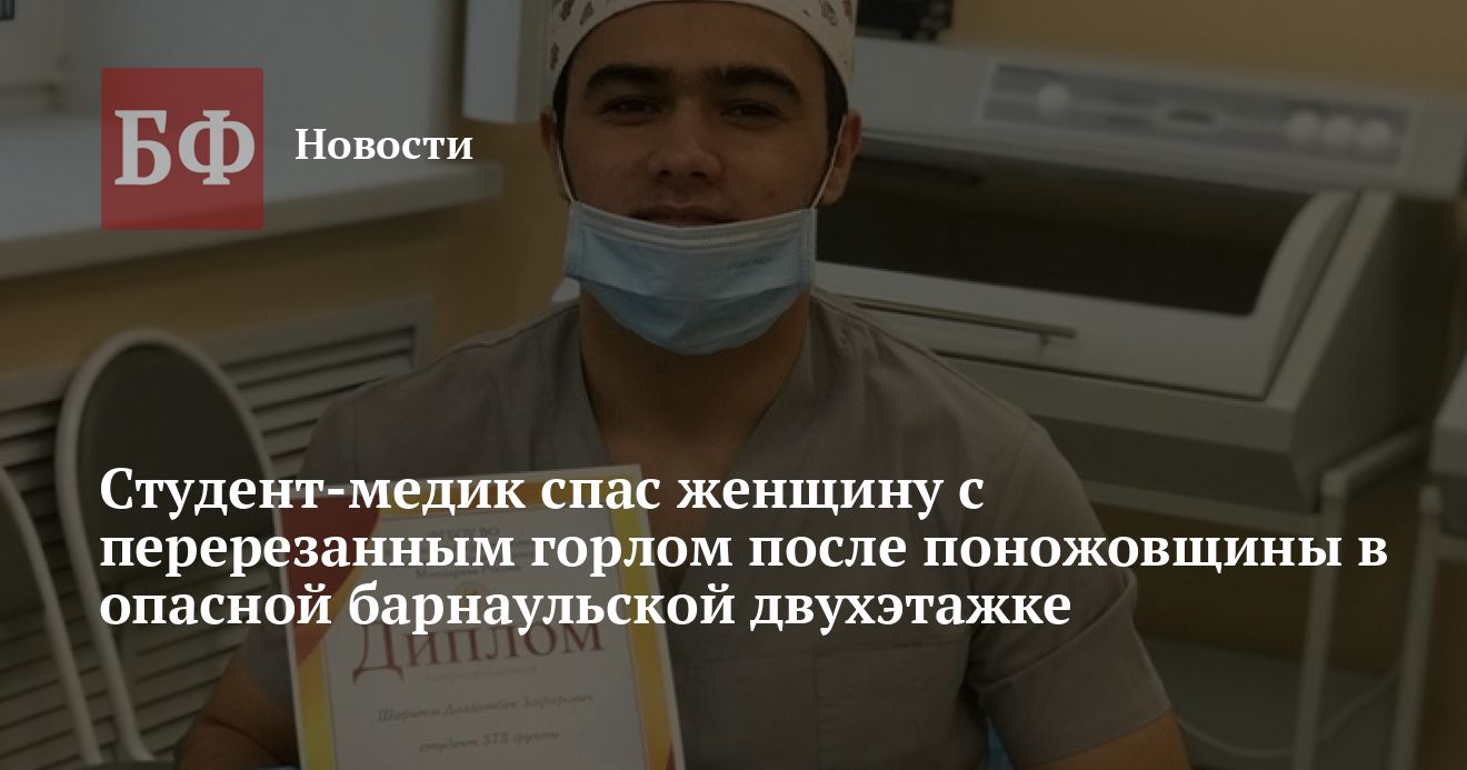 По сведениям источника, события происходили в старом жилом двухэтажном доме по адресу улица Ярных, 25. В одной из квартир компания распивала алкогольные напитки. В какой-то момент между потерпевшей и ее приятелем произошел конфликт, в ходе которого мужчина схватил нож и перерезал женщине горло. Очевидцы побежали по соседям звать на помощь. На призыв откликнулся юноша по имени Давлат Шарипов, который является студентом АлтГМУ. Будущий врач оказал пострадавшей первую медицинскую помощь и остановил кровотечение. Тем самым спас женщине жизнь. Спустя 10 минут после этого приехала неотложка, которая забрала пострадавшую в больницу.
