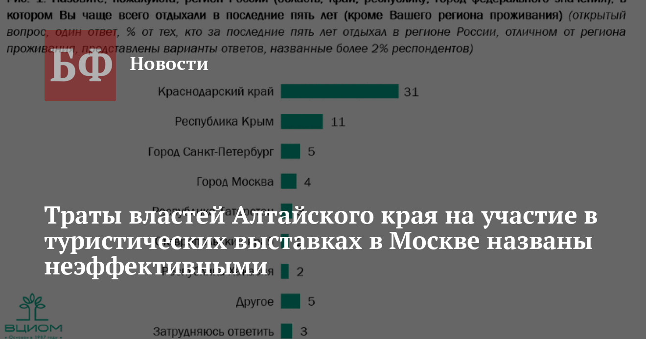 Отметим, что, судя по многочисленным сообщениям краевых чиновников, Алтай действительно часто участвует в различных туристических выставках, в том числе и в Москве, на которые тратятся миллионы рублей. В подтверждение слов Сергея Ромашкина также говорит последнее исследование ВЦИОМ о внутреннем туризме. Так, в тройку наиболее востребованных направлений вошли Крым, Москва и Байкал. Кроме того, лидерами голосования среди россиян в зависимости от цели поездки стали Крым (29%), куда люди отправляются в основном для отдыха и развлечений, Санкт-Петербург (58%) -осмотр культурных достопримечательностей, Байкал (19%) — природа, животный мир, Сочи (21%) — спортивный отдых, Кавказ (13%) — лечение. Вместе с тем, среди регионов с наибольшим потенциалом оказались Вологодская область, Сахалин и Шантарские острова.