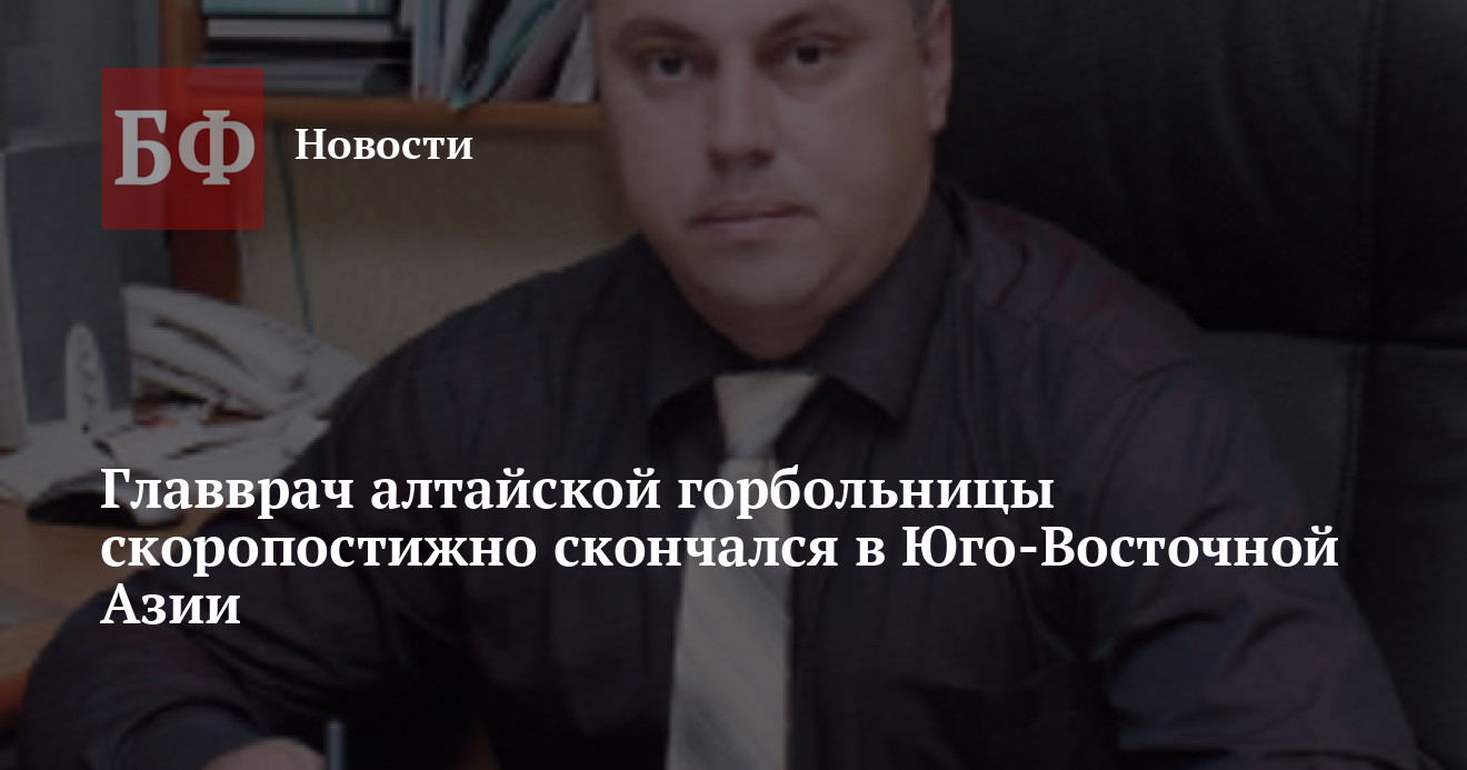 15 февраля в группе «Инцидент Рубцовск» «ВКонтакте» сообщили о смерти 44-летнего главного врача городской больницы № 1 Рубцовска Игоря Данилюка. Эту информацию подтвердил экс-главврач Егорьевской больницы Сергей Шуленин, который рассказал, что тот скончался во время пребывания во Вьетнаме. Пока нет официальной информации о причинах смерти и дате прощания с медиком. По непроверенным данным, у главврача произошел инфаркт.